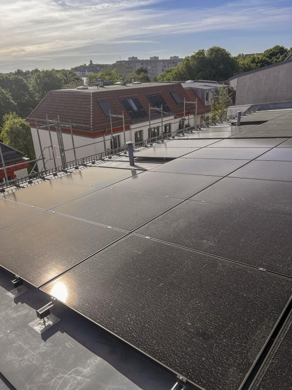 Was hier geschieht: Wir lassen eine Photovoltaik-Anlage (PV) auf dem Dach errichten – ein von uns initiiertes Pilotprojekt, für welches wir die Energie und Wasser Potsdam GmbH (EWP) als Kooperationspartner gewinnen konnten. Warum? Wir wollen unser eigener Stromlieferant werden und Solarstrom für eine sogenannte „gemeinschaftliche Gebäudeversorgung“ für uns selbst und alle Mieter im Gebäude der Geschäftsstelle nutzen. Diese Möglichkeit eröffnet das neue Gesetz „Solarpaket 1“, welches vor gut einem Jahr beschlossen wurde. Roman Poosch, technisches Vorstandsmitglied der 1956, erklärt die Idee so: „Wir nutzen dieses Pilotprojekt, um gemeinsam mit der EWP Erfahrungen zu sammeln: Wie funktionieren neue digitale Stromzähler, funktioniert die Abrechnung mit dem Netzbetreiber reibungslos, wann müssen wir Strom dazukaufen und wann speisen wir ein, wieviel können wir von unserem grünen Solarstrom selbst nutzen?“
