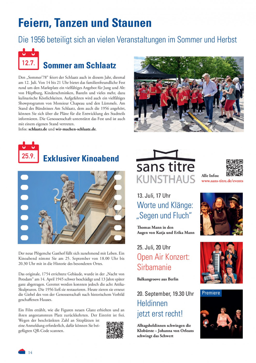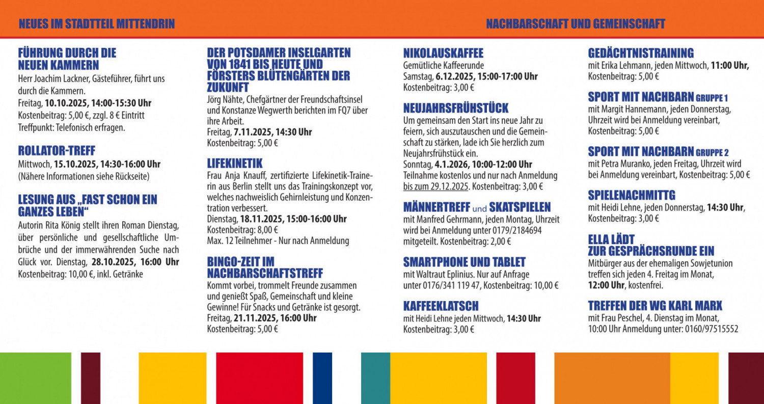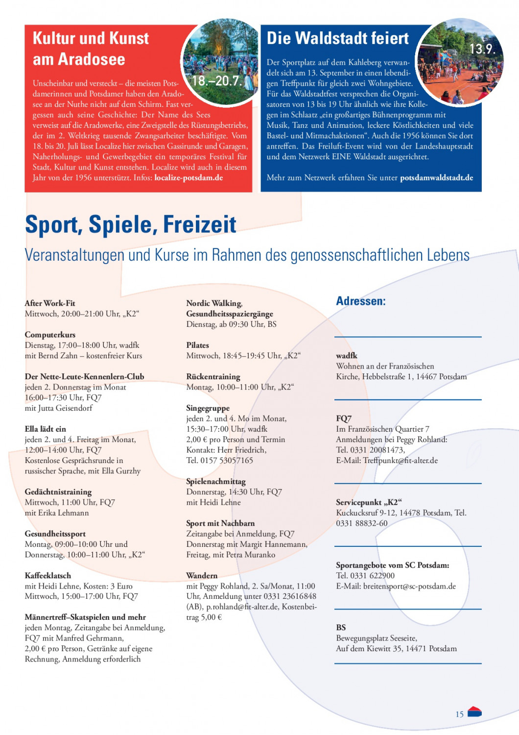 Veranstaltungen für Jung und Alt finden in den 1956-Räumlichkeiten im Französischen Quartier 7 (FQ7), im Veranstaltungsraum in der Hebbelstraße 1 und im 1956-Treffpunkt „Auf dem Kiewitt 14“ statt. Zusätzlich bieten wir dank unserer guten Beziehungen zu sozialen Einrichtungen, Vereinen und Organisationen in weiteren Stadtteilen Potsdams Unterhaltungs- und Freizeitmöglichkeiten an, etwa im „K2“ im Kuckucksruf 9-12" in Waldstadt, in der AWO-Seniorenfreizeitstätte im Wurzelwerk in der Waldstadt II, in der Bürgerbegegnungsstätte „Stern*Zeichen“ Am Stern und im „Bürgerhaus Am Schlaatz“.