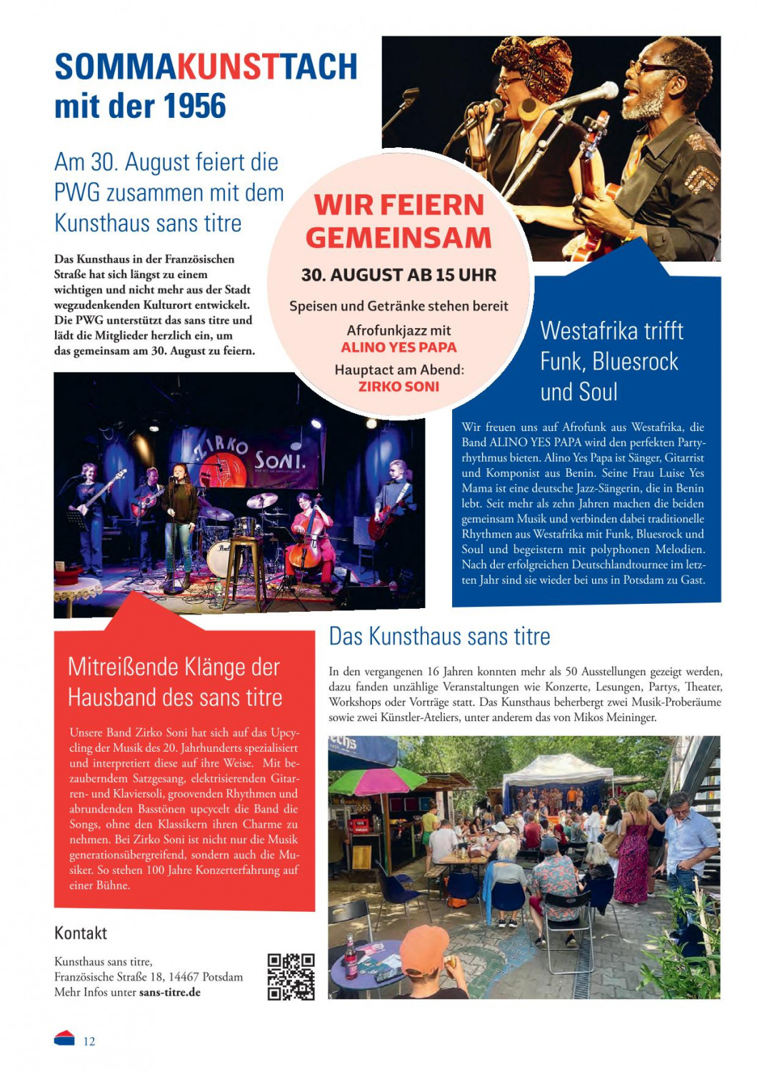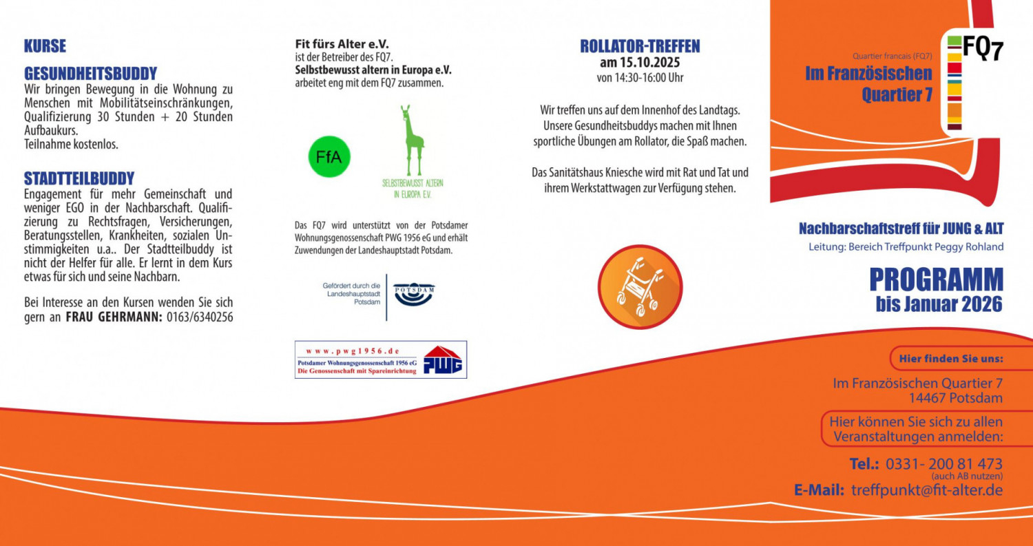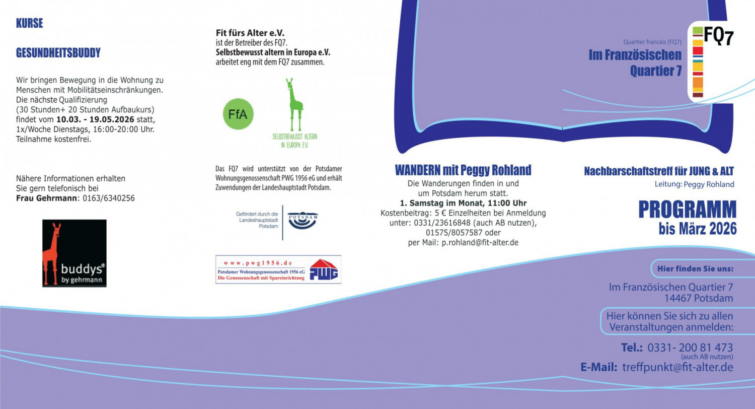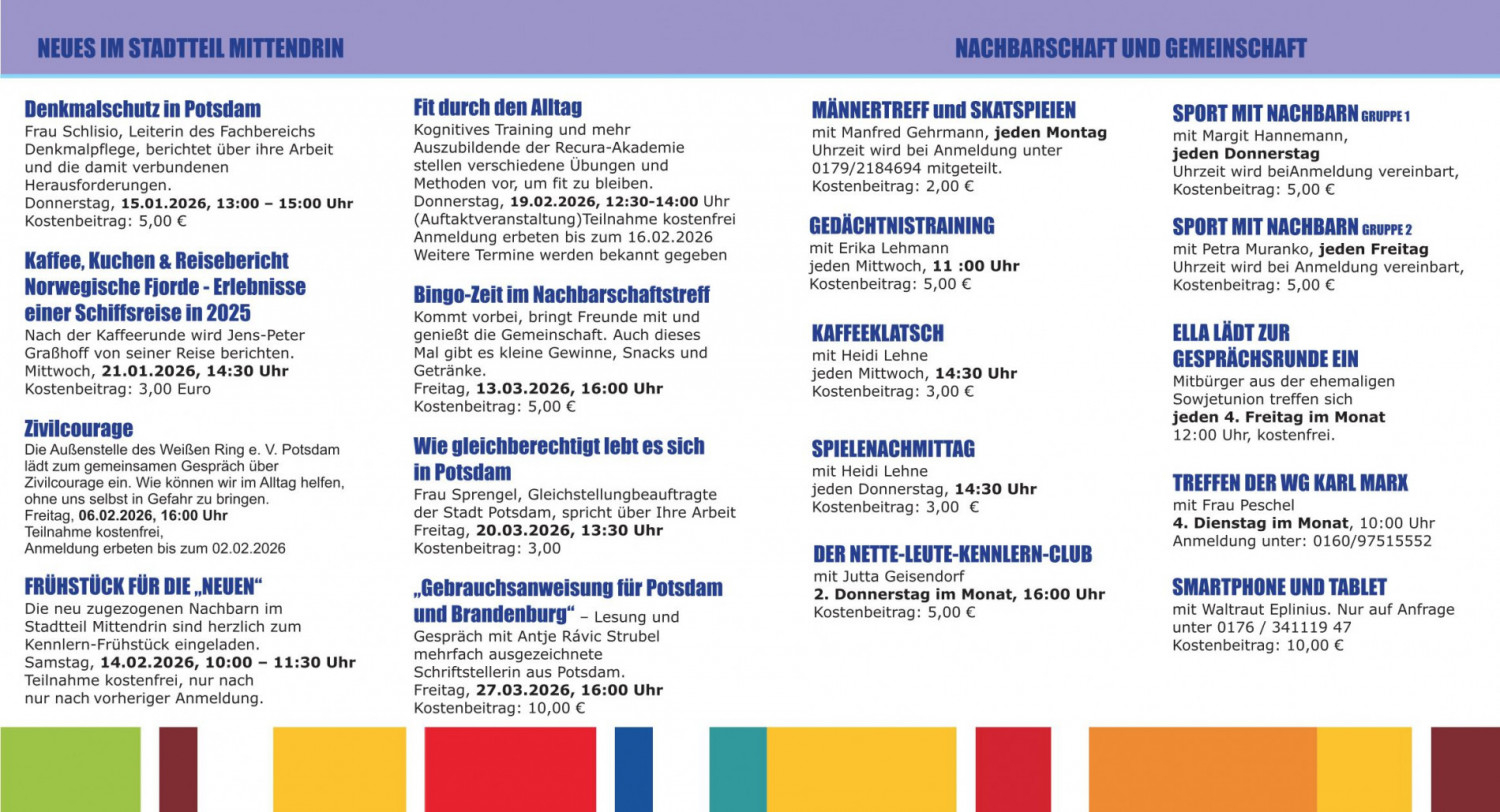 Veranstaltungen für Jung und Alt finden in den 1956-Räumlichkeiten im Französischen Quartier 7 (FQ7), im Veranstaltungsraum in der Hebbelstraße 1 und im 1956-Treffpunkt „Auf dem Kiewitt 14“ statt. Zusätzlich bieten wir dank unserer guten Beziehungen zu sozialen Einrichtungen, Vereinen und Organisationen in weiteren Stadtteilen Potsdams Unterhaltungs- und Freizeitmöglichkeiten an, etwa im „K2“ im Kuckucksruf 9-12" in Waldstadt, in der AWO-Seniorenfreizeitstätte im Wurzelwerk in der Waldstadt II, in der Bürgerbegegnungsstätte „Stern*Zeichen“ Am Stern und im „Bürgerhaus Am Schlaatz“.