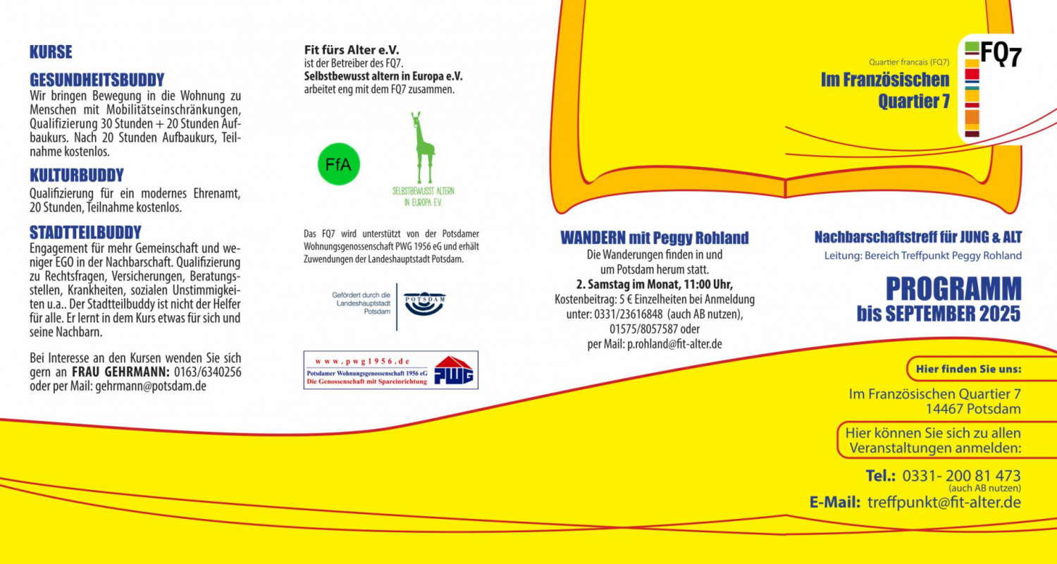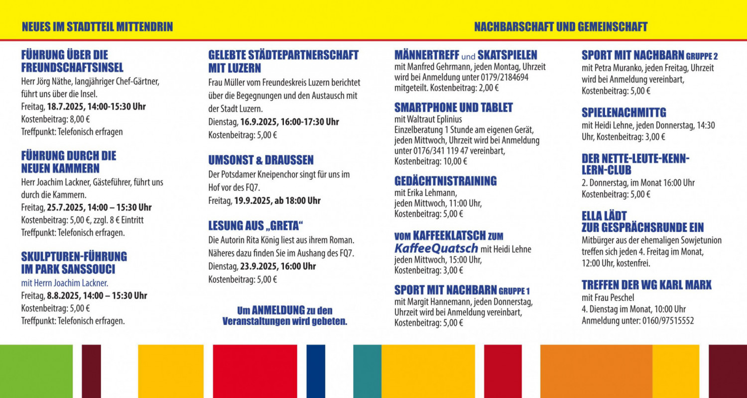 Veranstaltungen für Jung und Alt finden in den 1956-Räumlichkeiten im Französischen Quartier 7 (FQ7), im Veranstaltungsraum in der Hebbelstraße 1 und im 1956-Treffpunkt „Auf dem Kiewitt 14“ statt. Zusätzlich bieten wir dank unserer guten Beziehungen zu sozialen Einrichtungen, Vereinen und Organisationen in weiteren Stadtteilen Potsdams Unterhaltungs- und Freizeitmöglichkeiten an, etwa im „K2“ im Kuckucksruf 9-12" in Waldstadt, in der AWO-Seniorenfreizeitstätte im Wurzelwerk in der Waldstadt II, in der Bürgerbegegnungsstätte „Stern*Zeichen“ Am Stern und im „Bürgerhaus Am Schlaatz“.